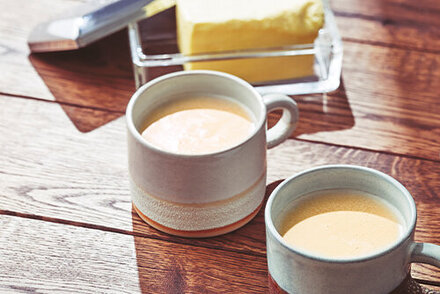 - ブラックコーヒーにグラスフェッドバターとMCTオイルを入れ、ミキサーで滑らかな泡ができるまで攪拌する。