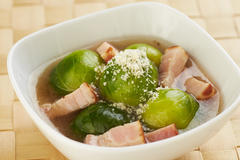 - ブロッコリーを食べやすい大きさに切り、塩茹でする。カリフラワーもブロッコリーと同様に切り、沸騰した湯に酢(分量外)を入れて茹でる。ヤングコーンは、包丁を斜めに入れ半分に切る。